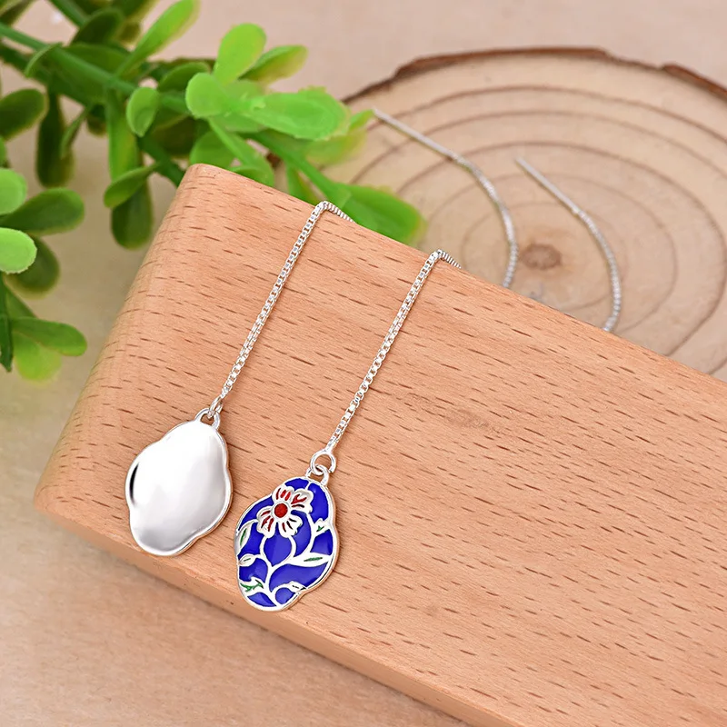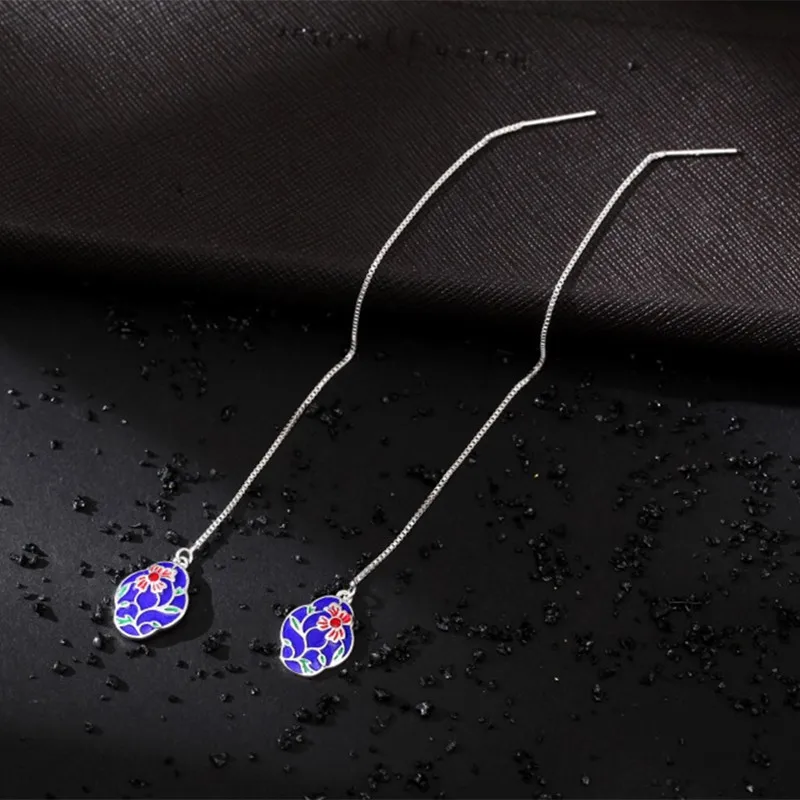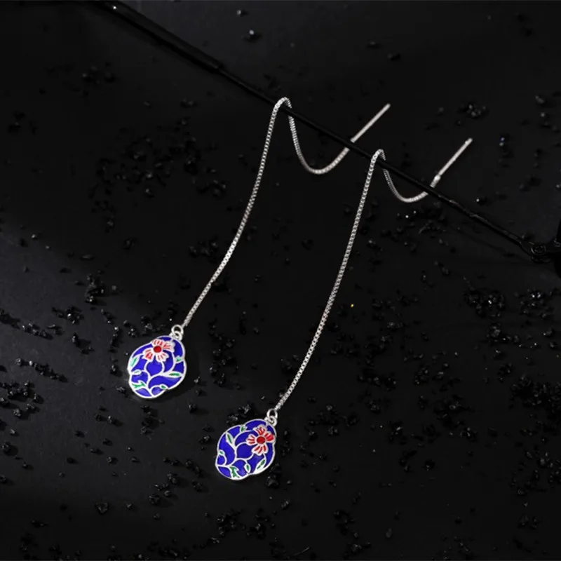 Buyee 925 Sterling Silver Long Tassel Earring Blue Enamel Peony Flower Earring for Women Fashion Ethnic Fine Jewelry Earring