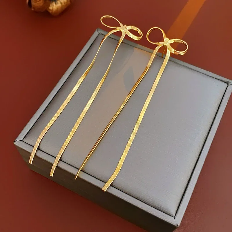 Fashion Long Tassel Bow Earrings for Women stainless steel Flat Snake Chain Bowknot Drop Earrings Statement Jewelry Girls Gift