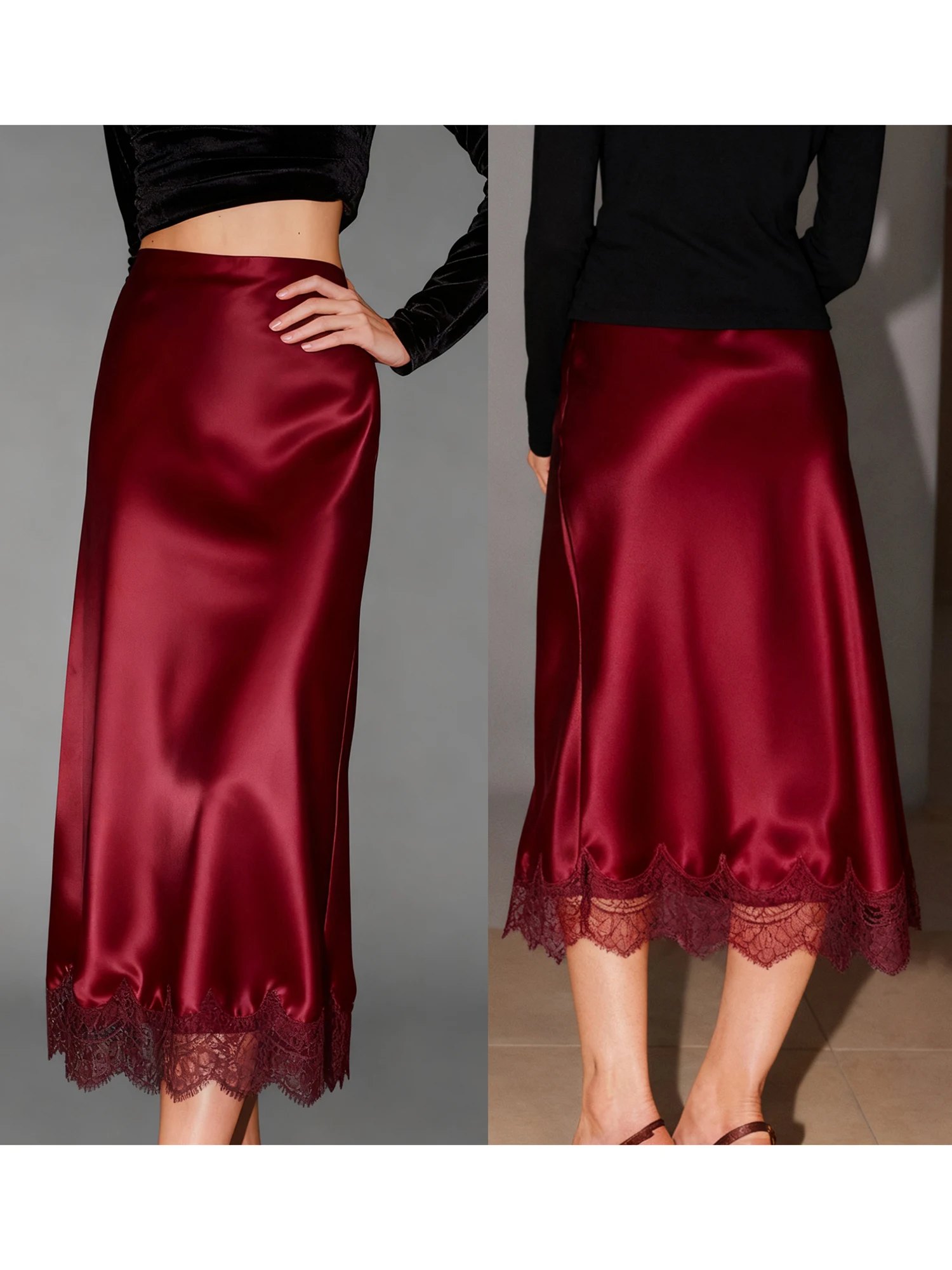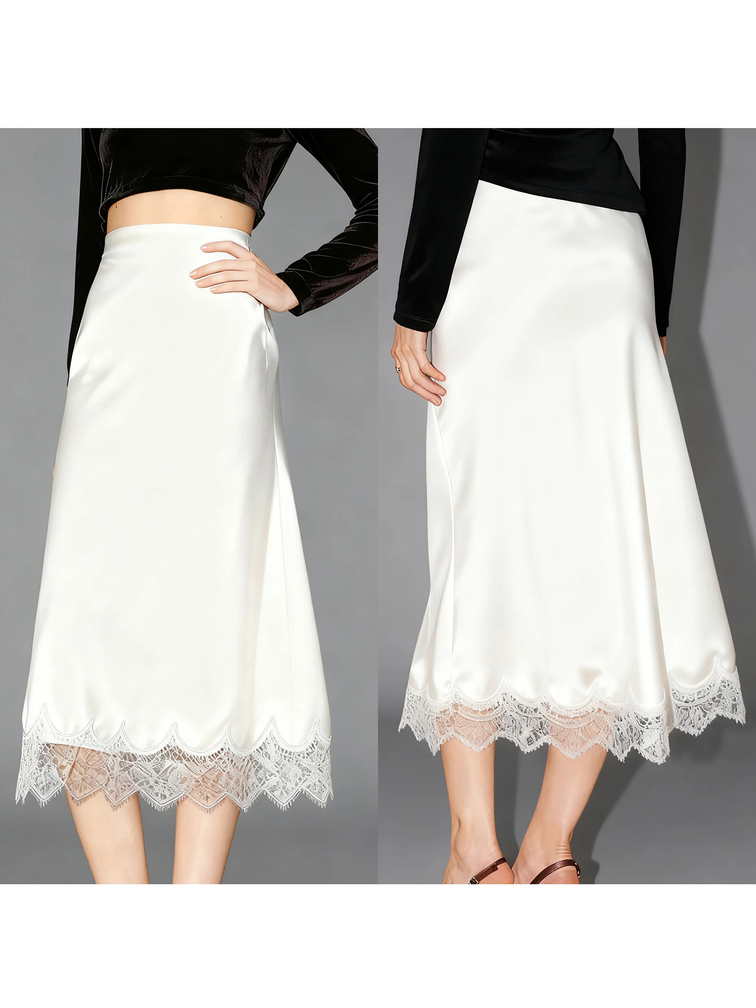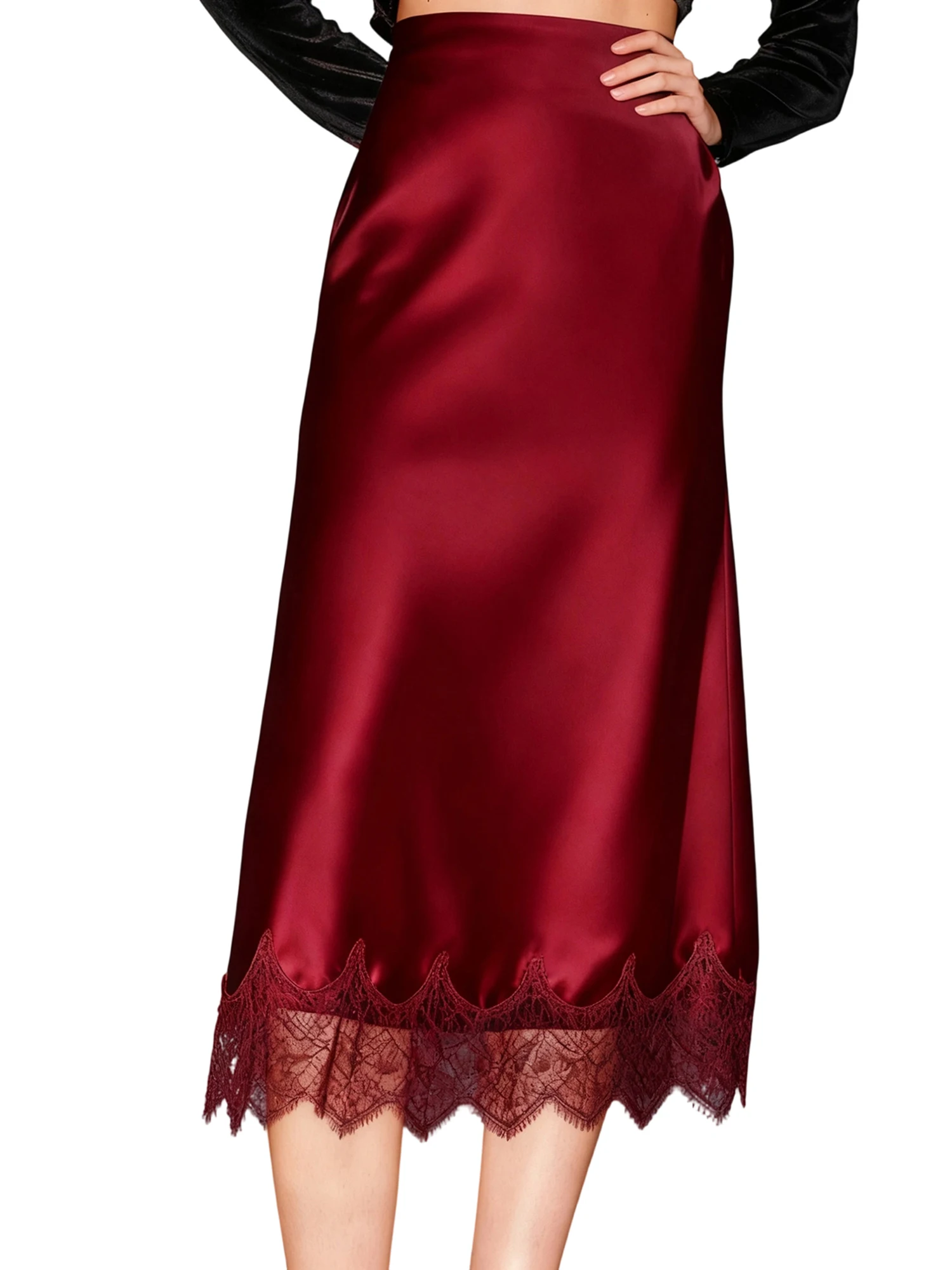 Women Half Slips for Under Dress Sheer Eyelash Floral Lace Trim Satin Silk Long Underskirt Extender Silky Slips Skirt