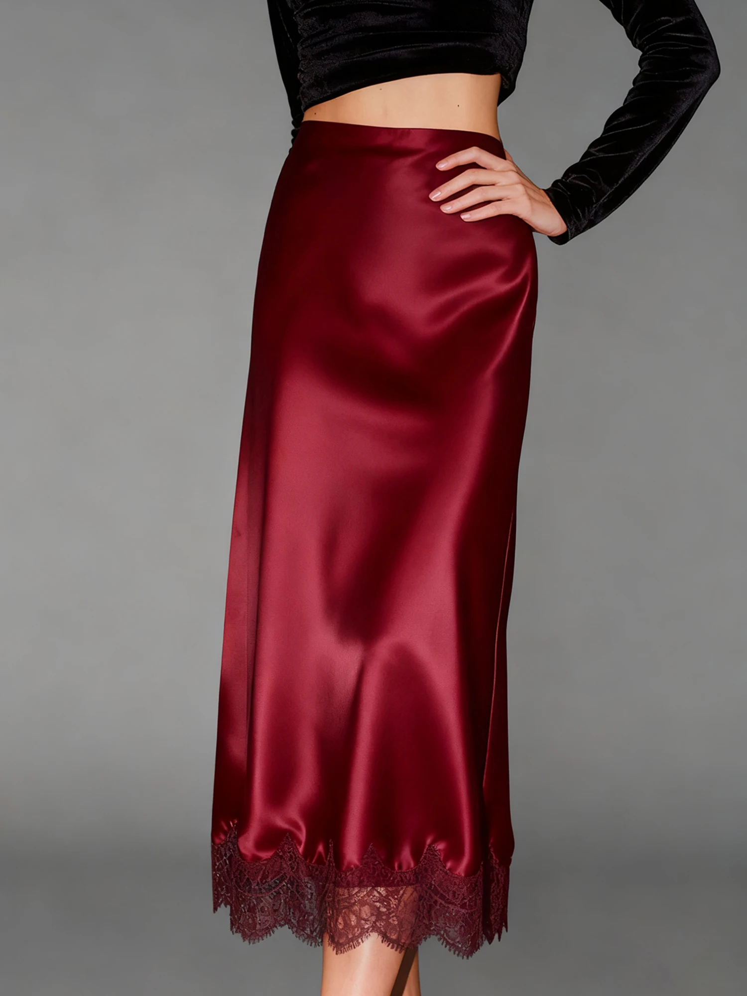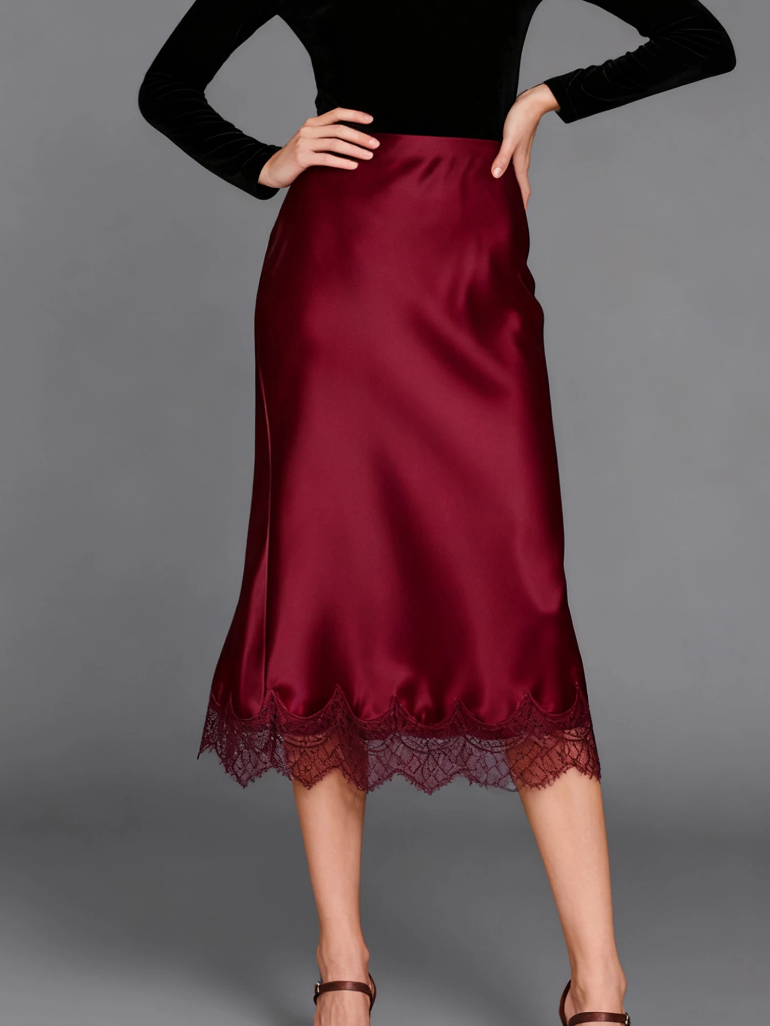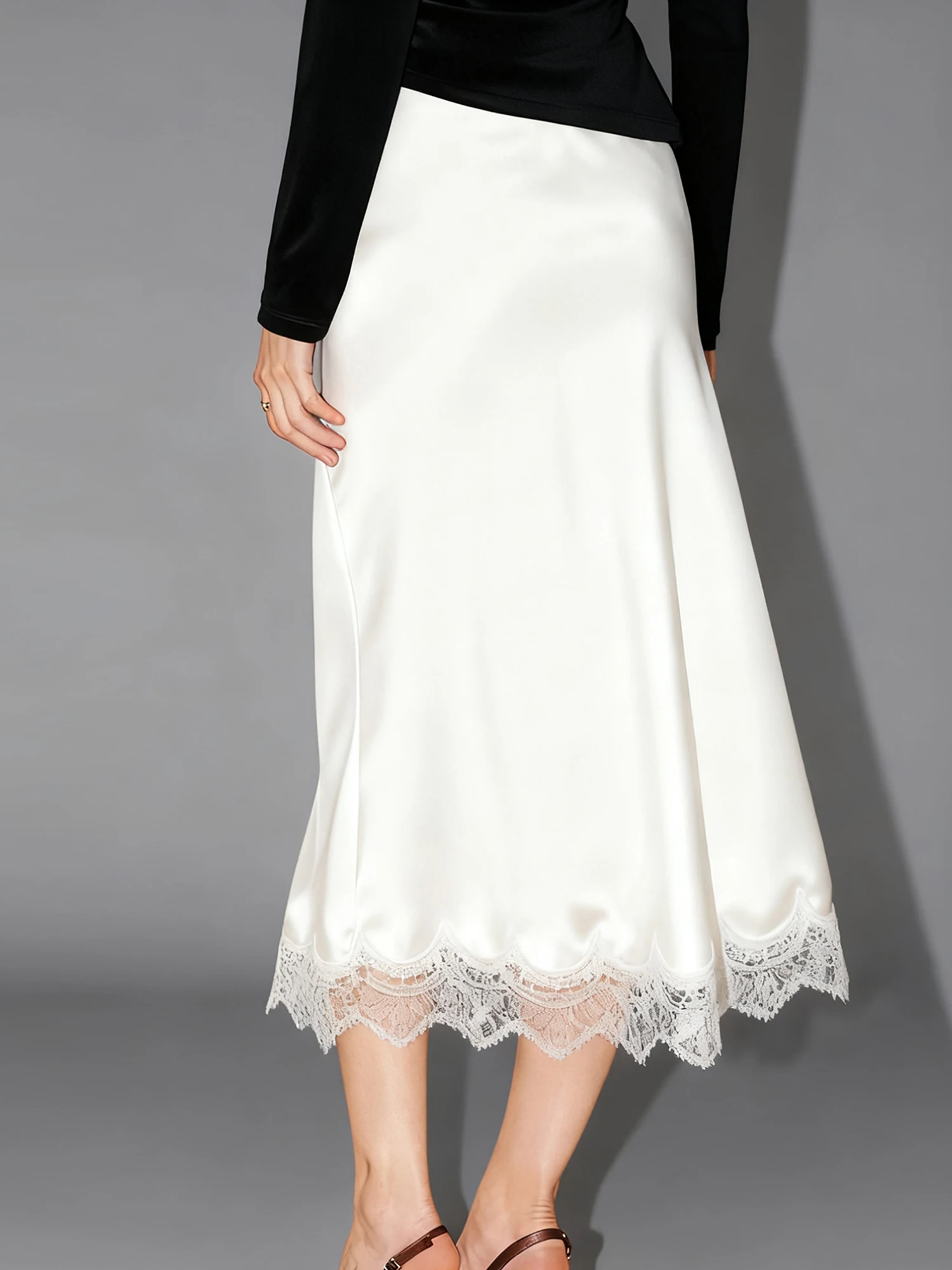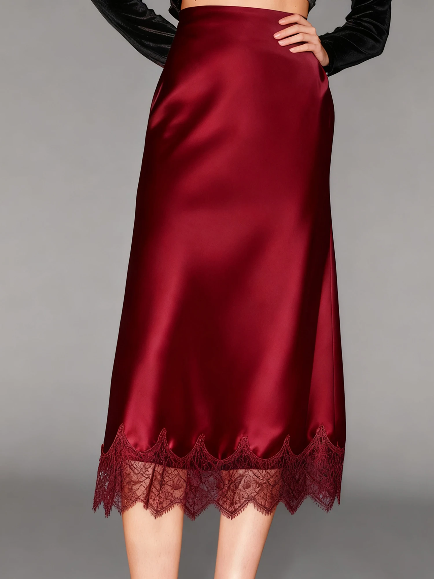 Women Half Slips for Under Dress Sheer Eyelash Floral Lace Trim Satin Silk Long Underskirt Extender Silky Slips Skirt