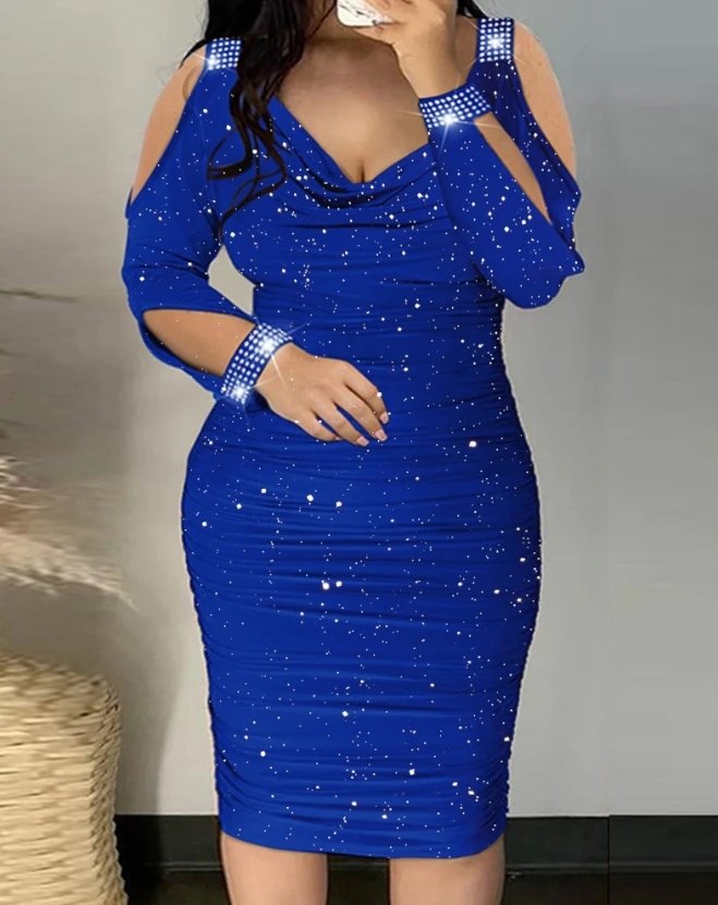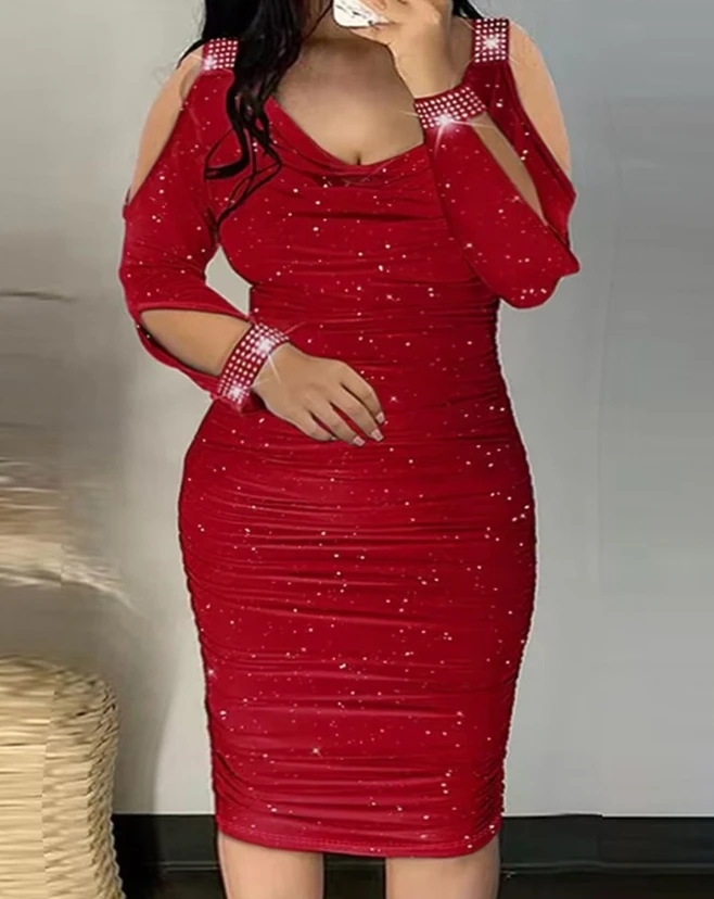 Women's Dresses 2024 Spring Fashion Rhinestone Cold Shoulder Long Sleeve Ruched Midi Sexy Party Dress Female Clothes
